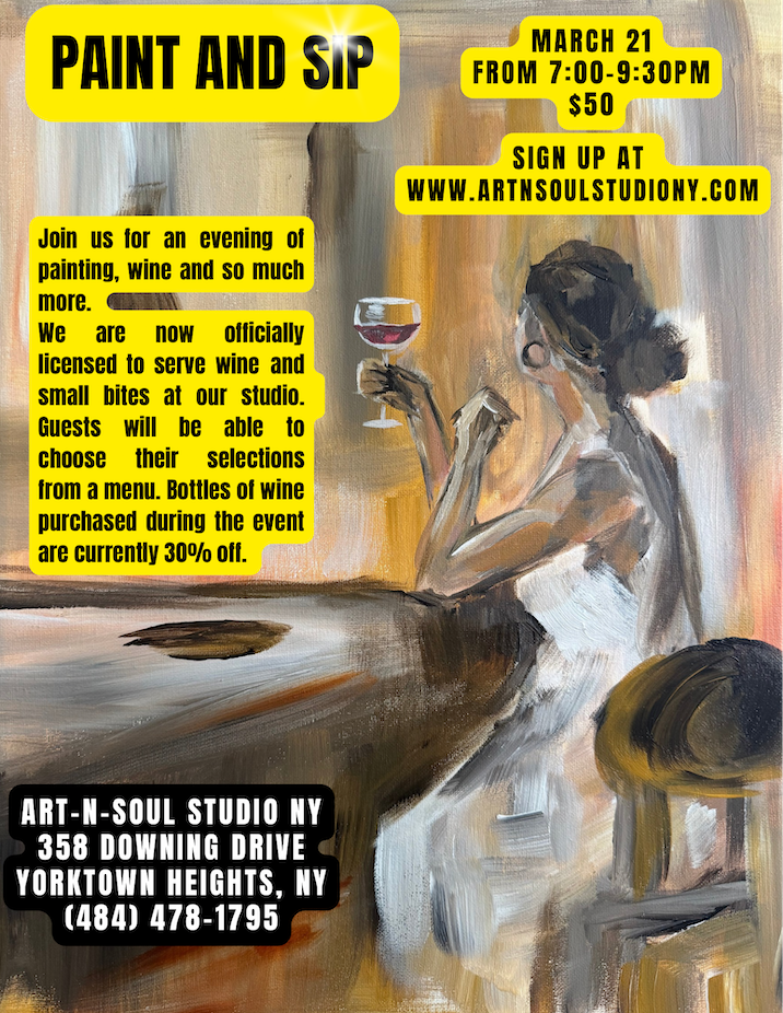 Join us for a Paint and Sip event on March 21 at 7:00pm.
